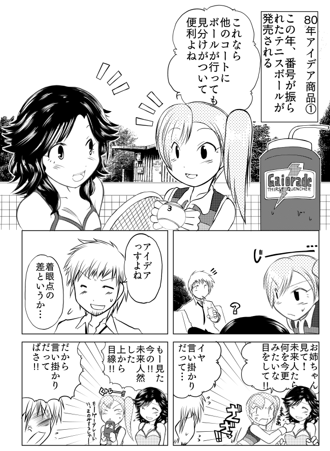 (1980年2月)テニスボールにもナンバー入りが発売された。ゴルフボールなみに、番号を刷り込んだ硬式テニスボールが全国的に売り出された。多面コートでプレーする際、自分のボールを見分けやすくするための新製品。(1981年平凡社百科年鑑より)